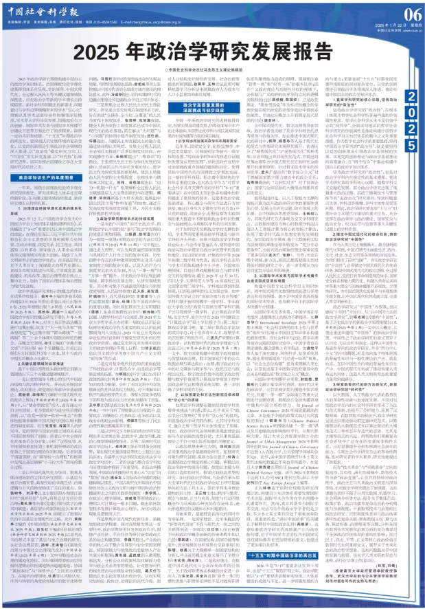 2025年政治学研究围绕构建中国自主的政治学知识体系,治国理政经验学理化成果得到体系化呈现,党的领导、中国式现代化、全过程人民民主等关键议题领域纵深推进,历史政治学等新的学术增长点持续拓展。面对学科布局提出的新要求、问题意识与学科边界模糊带来的学术“空心化”质疑以及学术话语权亟待加强等深层挑战,学术界从学科协同发展、加强理论与方法创新、国际学术发表与国际学术传播平台建设并进等方面进行了初步探索,取得一定的共识和成绩。“十五五”时期政治学的再出发,要深刻认识发展环境的复杂变化,以党的创新理论引领政治学各领域的深入推进,以“政治性”锚定研究方向、以“中国性”夯实研究基础、以“时代性”拓展研究边界,切实发挥治国理政之学在大变局时代的经世之用。