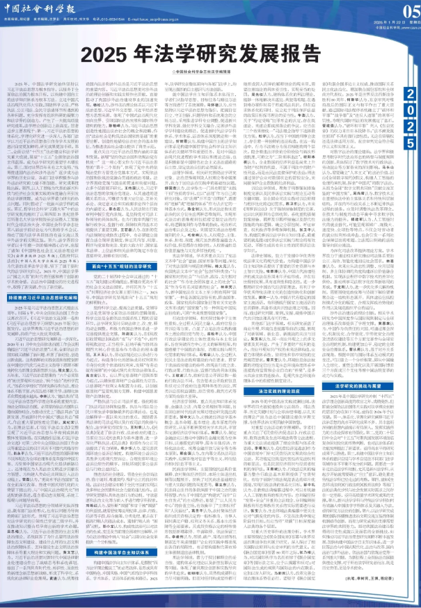 2025年,中国法学研究始终坚持以习近平法治思想为根本指导,以服务于全面依法治国为根本目标,以构建中国自主的法学知识体系为根本方法,立足中国式法治现代化伟大实践,围绕科学立法、严格执法、公正司法、全民守法诸环节所遇到的各种问题,充分发挥有组织科研的凝聚力和法学界的创造力,产生了一大批高质量研究成果,法学理论创新迈上新高度。显著进步主要表现于:第一,习近平法治思想的体系化、学理化研究进一步深入,各部门法学以习近平法治思想指引自身学术发展的意识自觉更加鲜明,研究成果更加丰硕。第二,全面总结“十四五”法治建设和法学研究重大成就,展望“十五五”全面依法治国宏伟蓝图,成为法学研究的重要学术增长点。第三,面对世界百年未有之大变局,“统筹推进国内法治和涉外法治”逐步成为法学界的历史自觉,各部门法学积极参与涉外法治研究的力量不断加强,研究成果推陈出新。第四,以人工智能为代表的新兴科技与经济社会发展实践的深度融合所引发的法学新课题,成为法学界着力研究的热点问题,同时推动了一批新兴法学科的成长。第五,哲学社会科学“五路大军”中的法学研究机构组织了以第四届21世纪世界百所著名大学法学院院长论坛暨人工智能时代全球法治大会、中国社会科学杂志社第八届法学前沿论坛为代表的学术会议,推动了国内法学共同体的有益交流以及中外法学的文明互鉴。第六,法学界部分学者以十年磨一剑的精神潜心治学,出版了诸如《中国特色社会主义法治理论研究》(法律出版社2025年版)、《政府何以法治》(中国人民大学出版社2025年版)为代表的诸多法学论著,留下了属于新时代的法学研究印记。2025年,中国法学界以“国之大者”的时代责任感和勇于创新的学术使命感,在法治中国建设的历史进程中,取得了新突破,作出了新贡献。